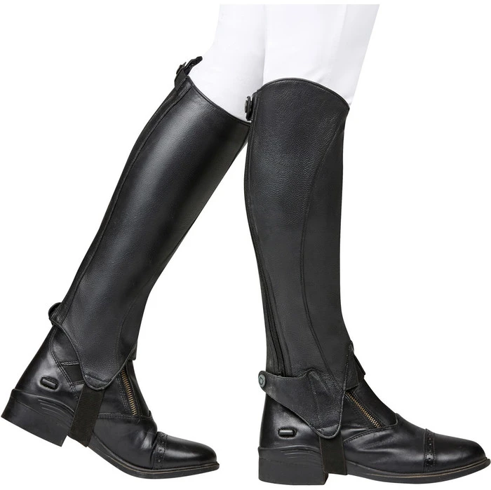 Soft and durable full cow leather half chap designed for a close feel with full length elastic stretch panel and YKK back zipper with Dublin snap closures. Hidden front elastic for the perfect fit.