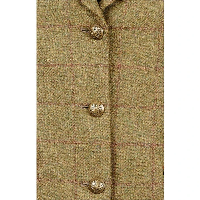 Tailored Jacket in wool blend fabric, fully lined. Antique brass stud buttons on front & cuffs. Flap pockets on front. Faux suede detail on lapel and pockets. Hanger and garment bag included. 45% Wool / 55% Polyester.